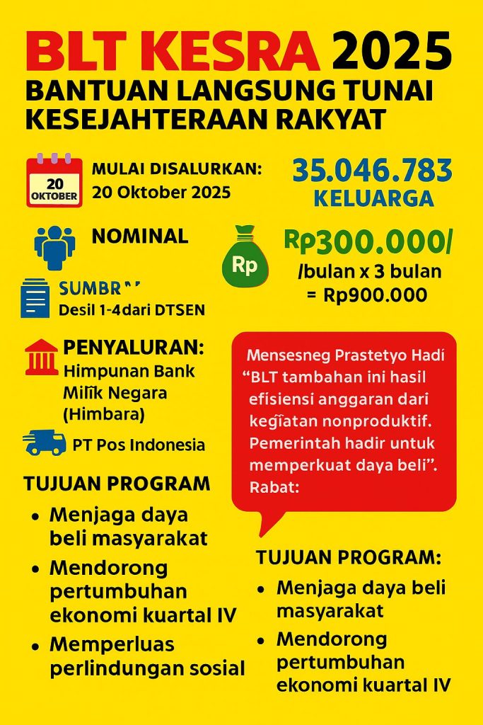Pemerintah Indonesia melalui Kementerian Sosial resmi menyalurkan BLT Kesra 2025. Bantuan ini diberikan kepada keluarga kurang mampu dengan total nilai Rp 900.000 per KPM untuk periode Oktober hingga Desember 2025. Selain itu, program ini hadir sebagai tambahan di luar bansos reguler seperti PKH dan BPNT, sehingga memberikan manfaat lebih bagi keluarga rentan. Sasaran dan Syarat […]